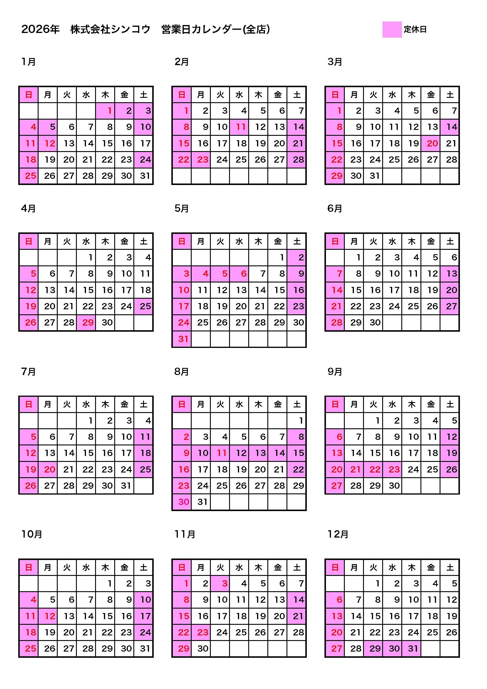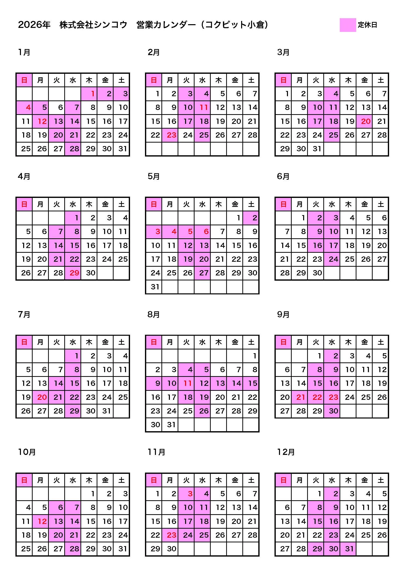各店舗及びコックピット小倉店の年間カレンダーをお知らせいたします。